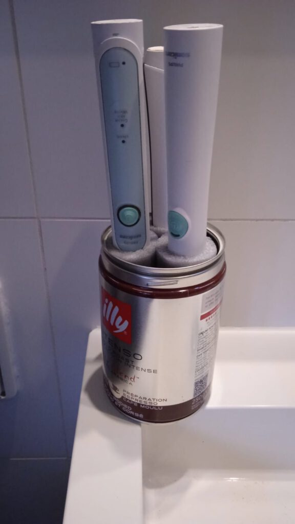 Omdat de meeste apparaten stuk gaan door insijpelend water en hardgeworden tandpasta wil ik dat voorkomen. Vooral het rechtopzetten staat garant voor langzaam intrekkende vocht. Het lijkt wel of ze dat express hebben gedaan, de rubbers gaan vanzelf rotten en zo wordt het nog erger totdat de dood erop volgt. Oplossing, zie foto, op zijn kop zetten maar oppassen dat de borstelkop niet in de drap komt te zitten. Heb daarom een buis van schuim in stukjes gezaagd, de opening wat groter ‘geboord’ en een oude koffiebus genomen, daar onderin wat cement zodat ie niet te snel omvalt. Nu maar kijken of dit stand houdt. Maar heb je andere oplossingen voor dit vraagstuk? Is er iets in de handel of kun je zelf iets slimmers en mooiers maken?