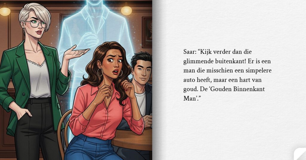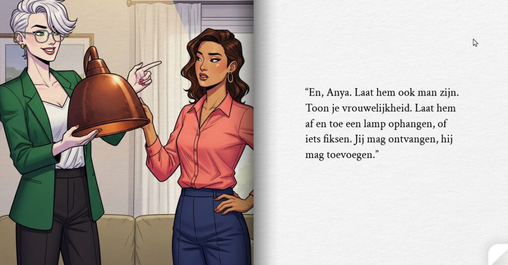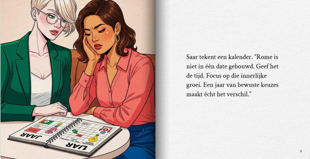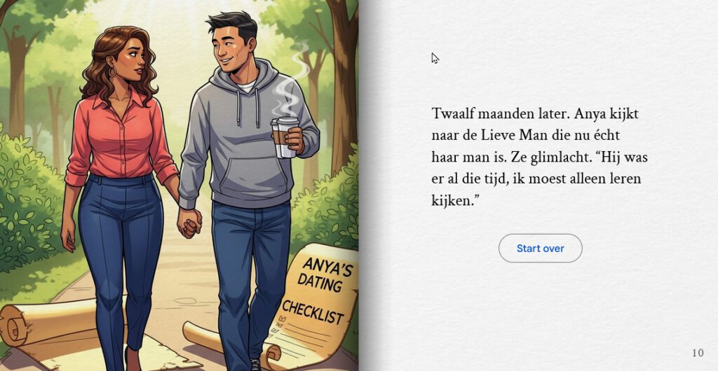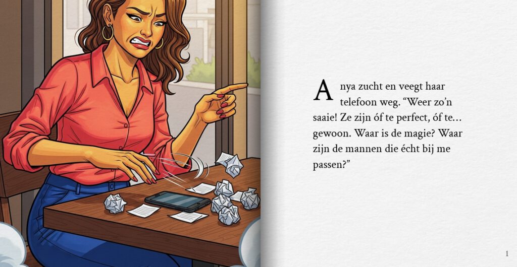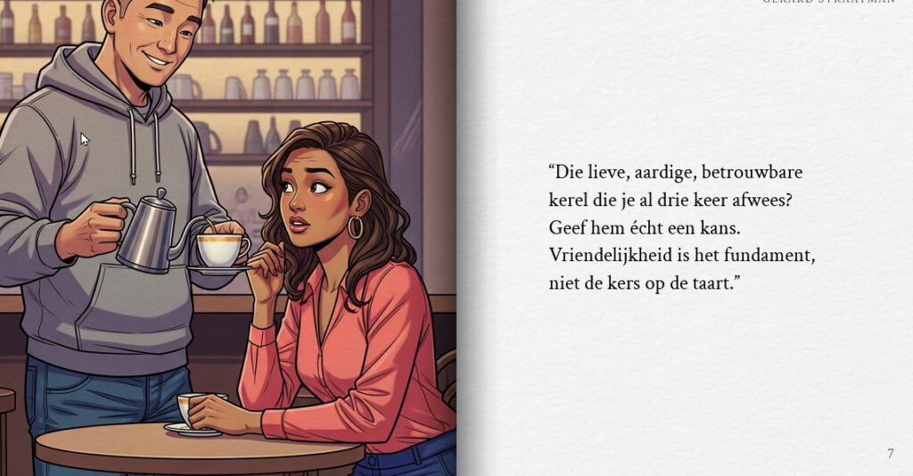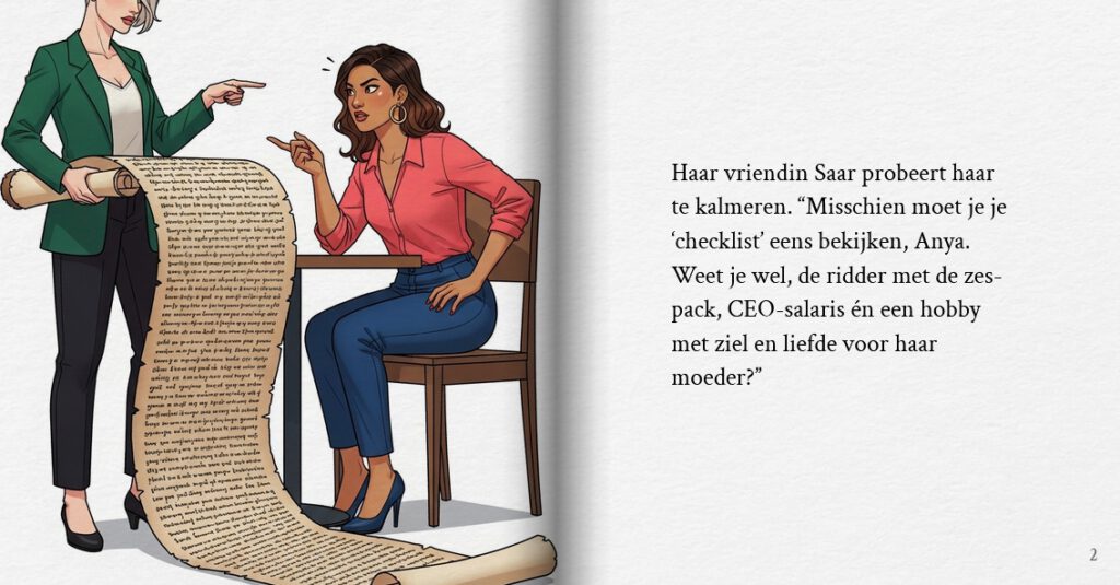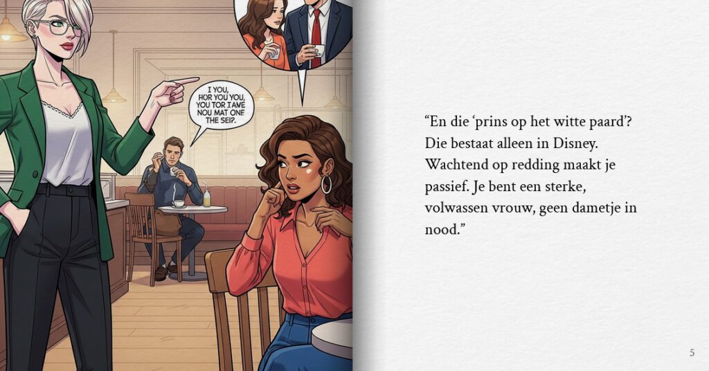 Ik heb een geïllustreerd verhaal voor volwassenen gemaakt, gebaseerd op de kernpunten van ‘Vind je Eindman’, dat vrouwen aanmoedigt hun datingstrategie te herzien, hun eisen bij te stellen en meer te focussen op de ‘gouden binnenkant’ voor een duurzame relatie