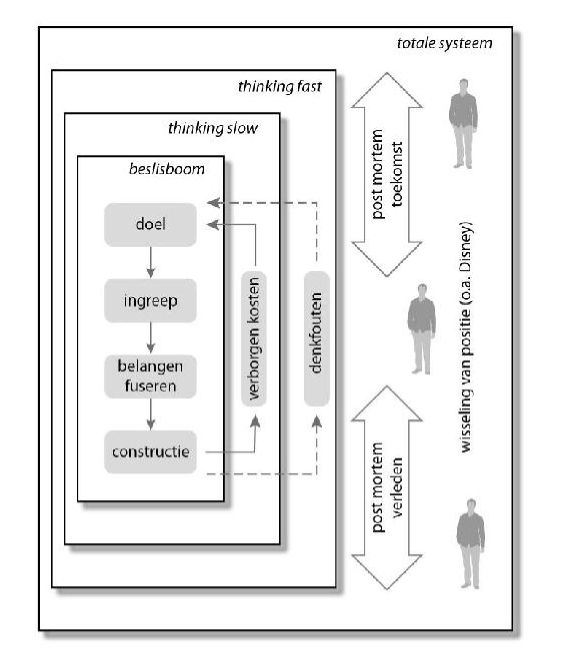 Alles in een schema. Het begint bij een rationele beslissing over doel en rendement van een project/besluit. Dan kijk je naar de verborgen kosten (vergaderen kost ook tijd etc), dan naar de denkfouten die mensen eigen zijn, om tenslotte het geheel nog eens te overzien en vanuit andere posities te kijken (oa Disney-strategie).