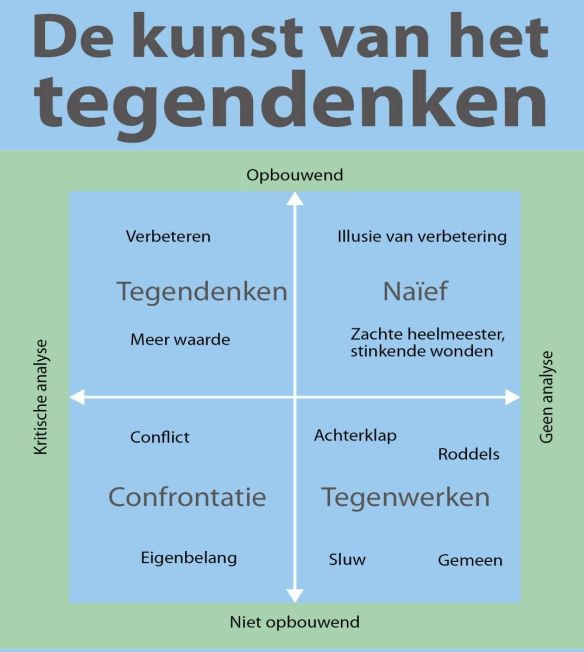 In 2015 heb ik met Stijn van Liefland een boek geschreven met als titel ‘De kunst van het tegendenken’. Hier heb ik het eerder aangehaald toen ik een 2e poging deed om het denkraam van filosoof Bas Haring te ontleden. Onderdeel van ’tegendenken’ was onder andere dat je vanuit het denken van de ander naar hetzelfde vraagstuk kon kijken om zo je blik te verruimen en beter in dialoog te kunnen gaan. Het hele boek is hier overigens gratis te downloaden.