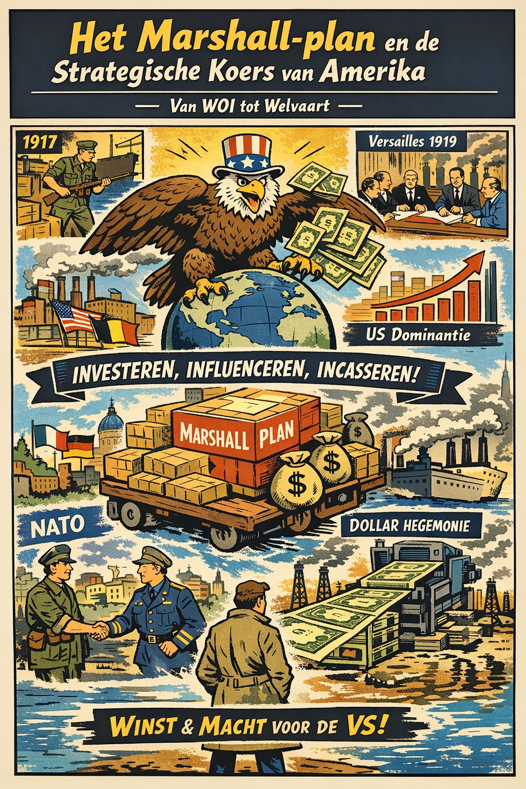 Nieuwe afzetmarkt creëren: Dit is eigenlijk het sterkste motief en het minst complotachtige. De Grote Depressie had aangetoond dat de Amerikaanse binnenlandse markt de industriecapaciteit niet kon absorberen. Een wederopbouw-Europa was een enorme markt — wat ook de logica achter het Marshall-plan verklaart. Je bouwt een klant op.