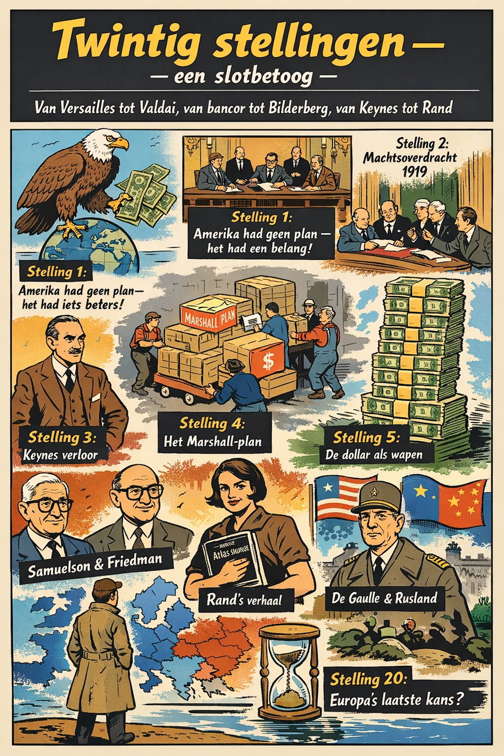 Een plan veronderstelt een regisseur en kan mislukken. Wat Amerika had was structureel eigenbelang dat consequent werd nagestreefd, ongeacht wie er in het Witte Huis zat. Van de Trading with the Enemy Act in 1917 tot de importtarieven van 2025 loopt één ononderbroken lijn: Amerika handelt als grootmacht, niet als bondgenoot. Wie dat een plan noemt onderschat het. Structureel eigenbelang is robuuster dan elk complot — het heeft geen coördinatie nodig en kan niet worden verraden door een klokkenluider.