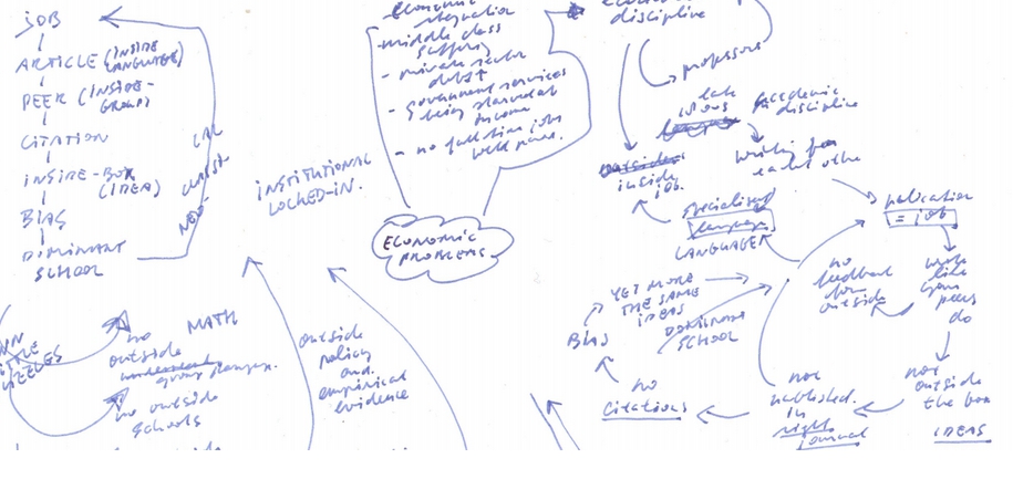 Zie je: onleesbaar en met een vulpen in een groot schrift, lekker knoeien, pijlen trekken, doorstrepen, vraagtekens erbij zetten, uitroeptekens. Dit schema heb ik daarna uitgewerkt in een beter leesbaar geheel op de manier die in deze blog wordt geanalyseerd, zie ‘blaming the economic profession.